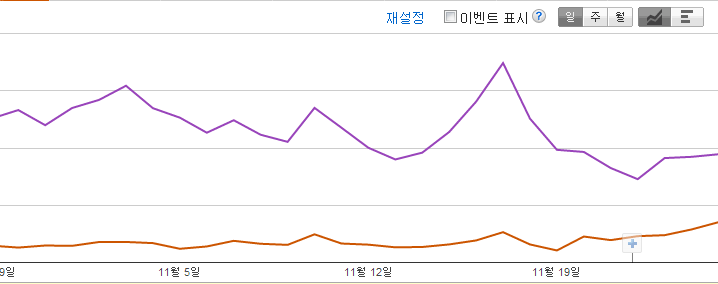 수익이 많이 나는 사이트에(보라) 공을 들이고 계속 관리를 하다가 2위 사이트를(빨강) 일부 리뉴얼했더니 이녀석도 수입이 증가하네요. (+표시 시점부터)