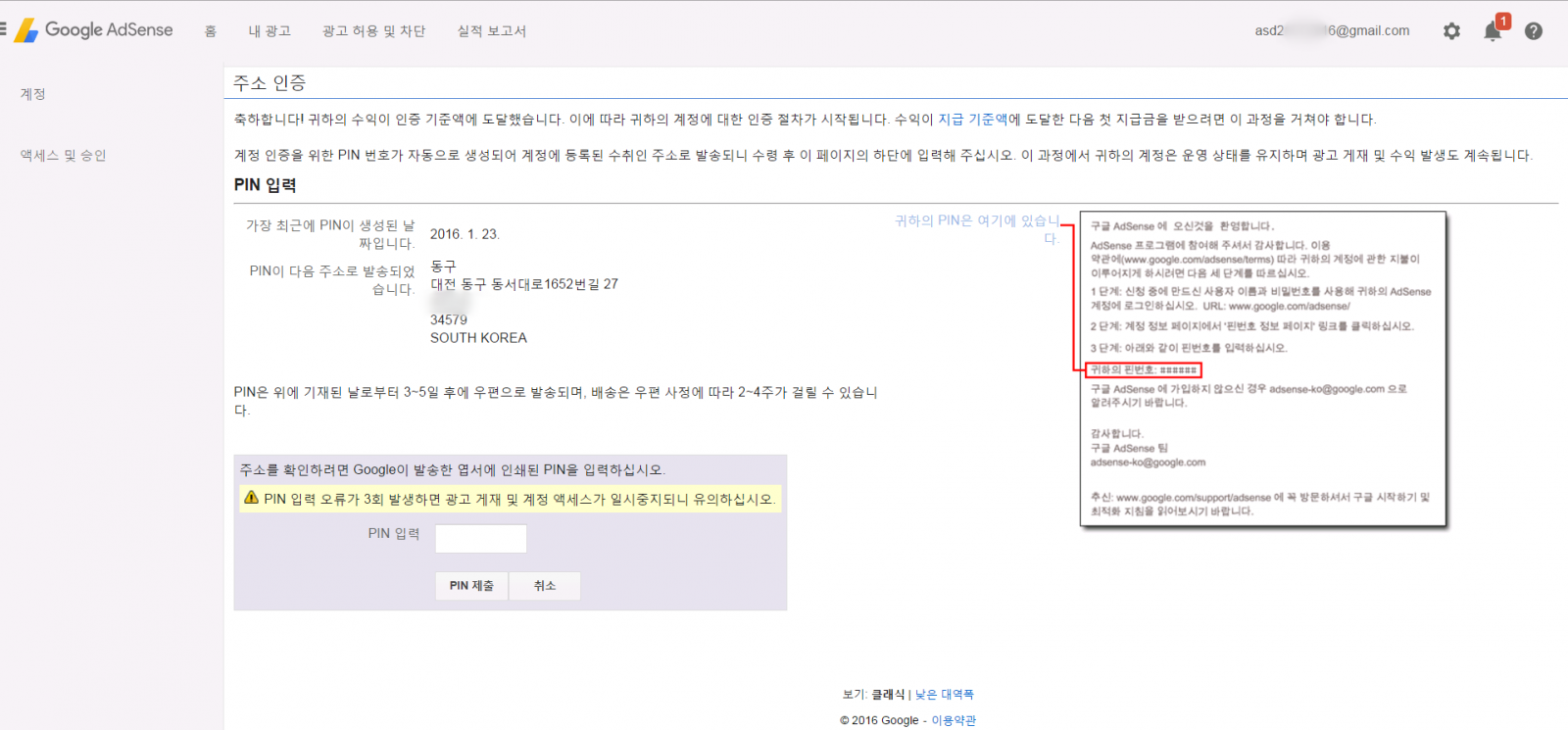 입력한 주소로 pin번호가 적혀있는 엽서가 날아옵니다. 그 번호를 입력하시면 수익금을 지급받을 수 있어요. 2-4주 걸린다고 하는데 저는 6주쯤 걸렸어요..