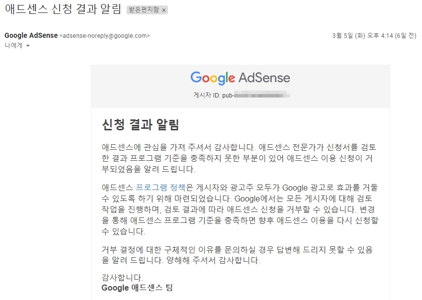 1. 메일 제목: "애드센스 신청 결과 알림"