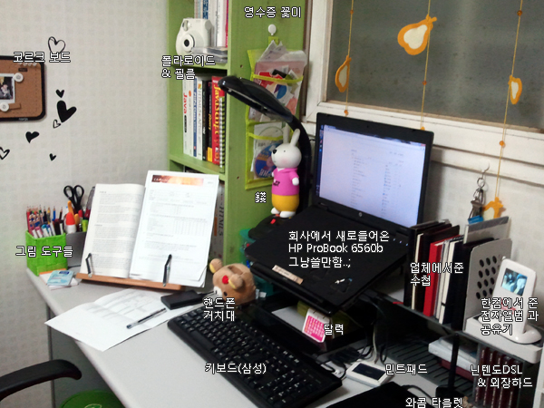 옆에 보이는 컴퓨터가 봄맞이 개편사진에서 보였던 메인노트북입니다. 지금은 서브로 쓰이고 있습니다.