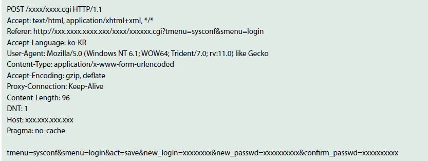 국내 모 업체의 각기 다른 유•무선 공유기 3종을 테스트한 결과, 동일한 CGI 및 매개변수를 사용하는 것을 확인하였다. 다음은 해당 공유기들을 이용해 테스트 공격을 수행하여 단계별로 분석한 내용이다.