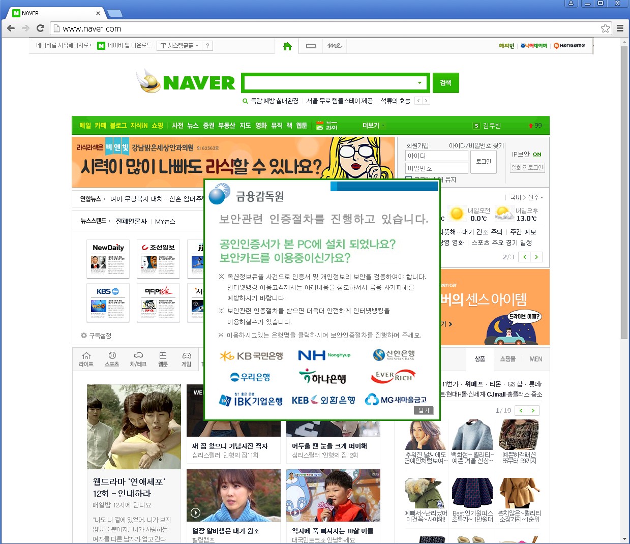 호스트파일이 변경되어서 국내 중요사이트 접속시 다른 사이트로 변경되서 나오게 되어져 있습니다.