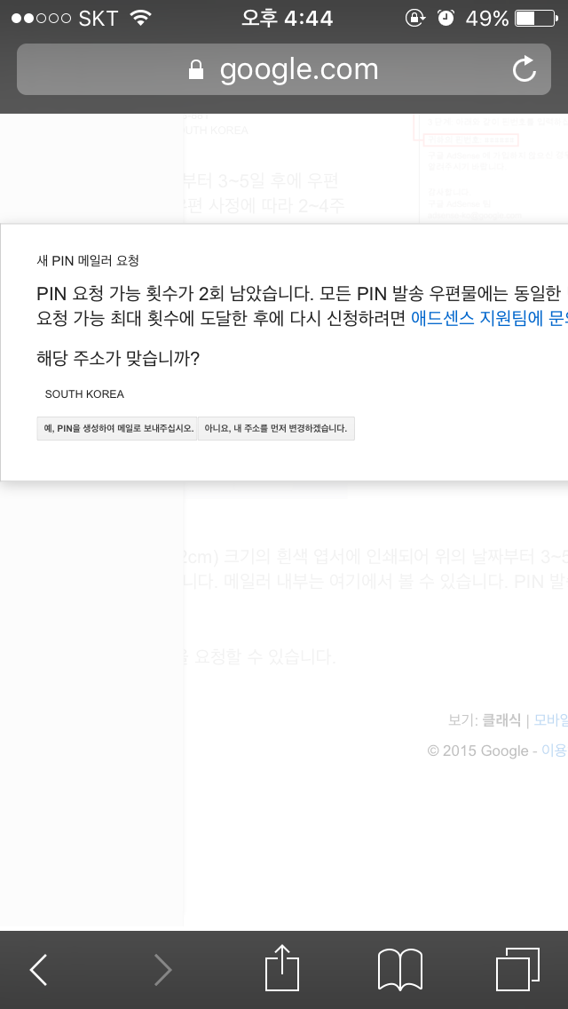 그래서 재발급버튼을 누르니 주소를 다시한번 확인시켜주는데 south korea 딱 이것만 나오고 세부주소가 아예 안뜨네요ㅠ 분명 첫번째 핀은 제대로 된 주소로 발송됐다고 나오고 현재주소도 잘 표시되고있는데 재발급버튼만 누르면 이렇게 south korea만 달랑 뜨네요 이런경험하신분 계실까요? 그냥 진행하면 되려나요