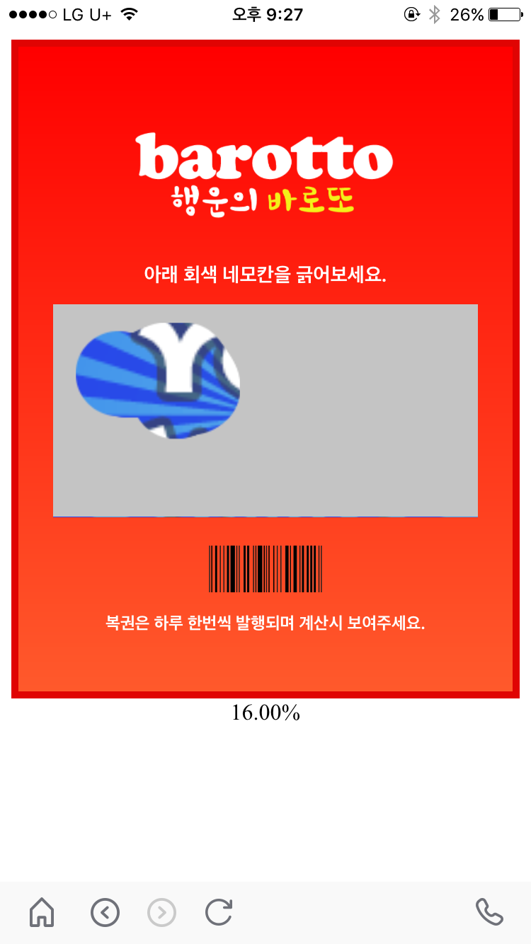 하루 한번 복권이 나가고 긁어서 당첨되면 음료나 1+1행사하려구요 ㅋ 큐알코드 적립가능도 넣고 고객을 한번 사로잡아 봐야겠네요 ㅋ복권 긁는 퍼포먼스가 부드러워서 만족스럽네요 ㅋ