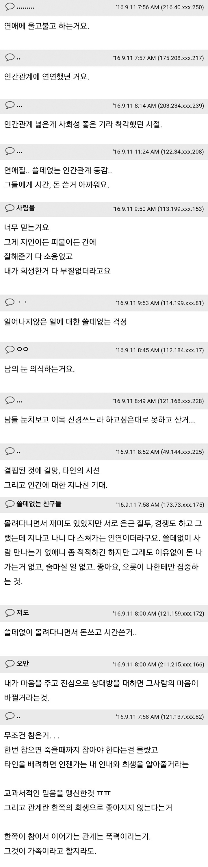 @묵공 이 댓글들이 가슴 언저리 한 구석에 박히는 이유는 나에게 일어났던 일, 남이 나에게 상처줬던 일들이 오버랩되었기에 그럴 것이라 생각합니다. 인간관계라는 것이 한 번의 상처로 망가지고, 그 망가짐이 들불처럼 번져서 모든 인간관계에 영향을 미치곤 하잖아요. 그러다가 다시 새로운 인간관계에서 치유받고, 또 그 치유의 힘이 들불처럼 번져서 다시 인간관계에 희망을 가지게 되고... 저 댓글들도 어차피 한 토막, 한 시점의 자기 시선이고 편린이라고 생각해요. 인생을 길게 늘어놓고 보자면 암울한 시기쯤? 된다고 보여지네요^^;;