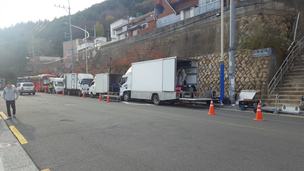 대신 도로 한차선을 점유하고 있는 촬영장비 차량들을 찍어 봤습니다.