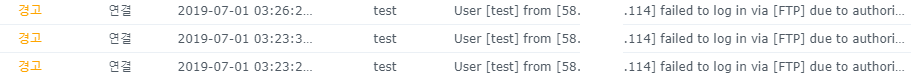 오늘 업무를 하는 도중에 알림이 울려서 봤더니 ftp 접속 차단 당한 아이디가 나왔네요...