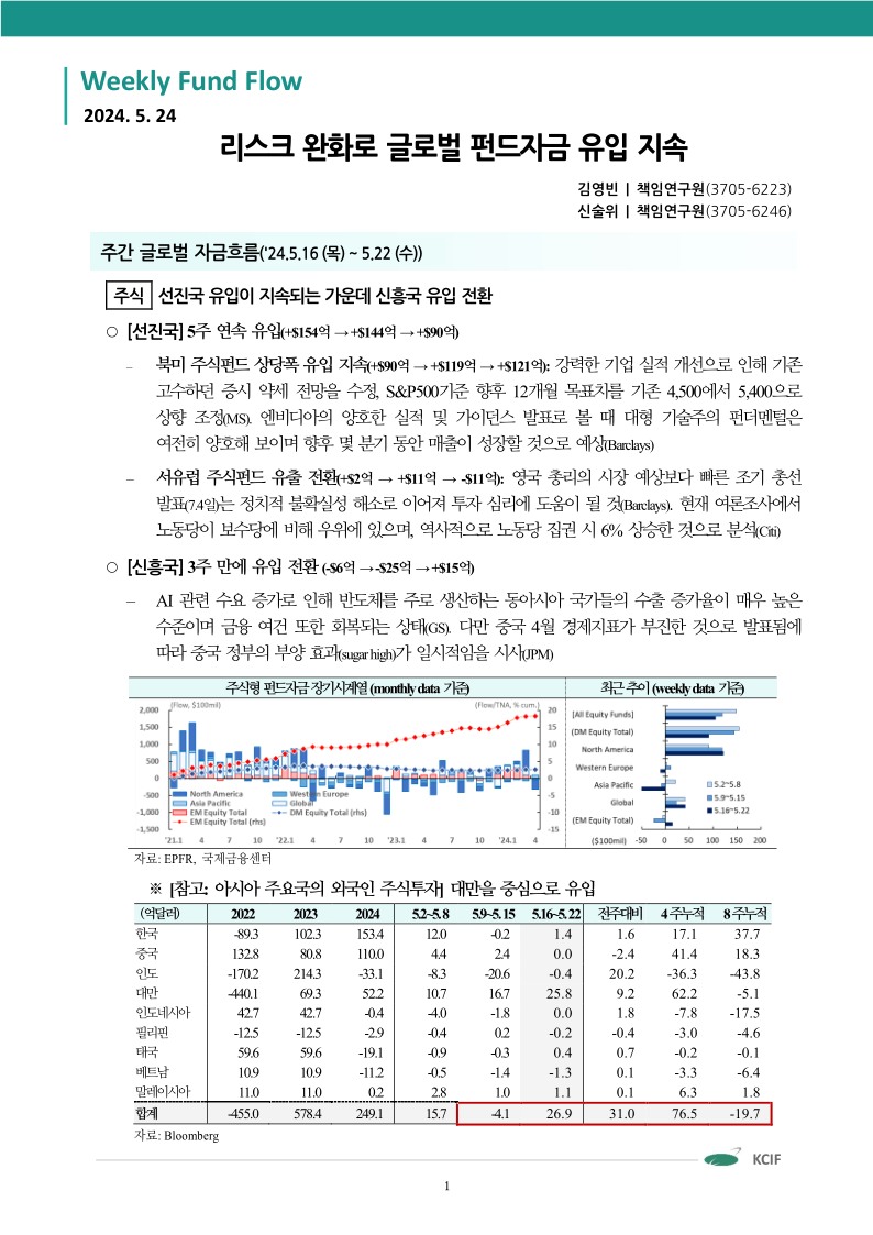 ㅁ (주식) 선진국 유입이 지속되는 가운데 신흥국 유입 전환