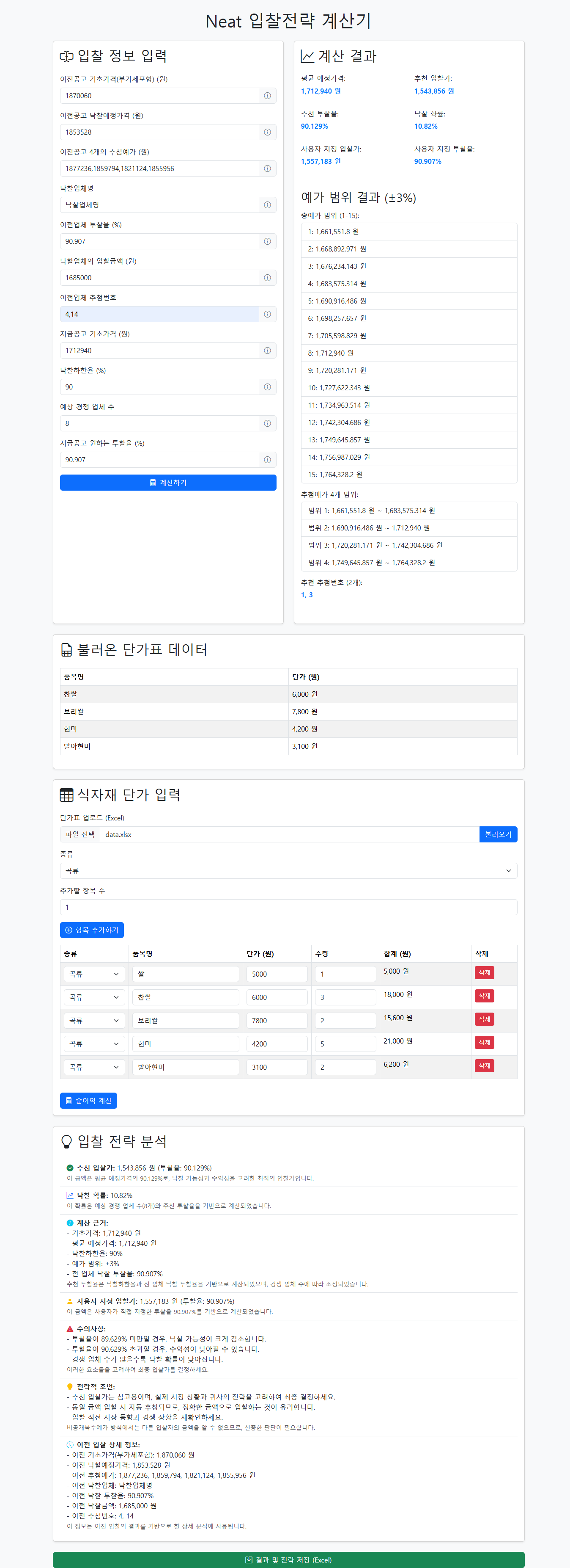 범위는 기존 비공개 복수예가방법에서 +-3% 를 반영하고 NEAT같은경우 97%~100.03% 를 사용하기에. 이를 반영했습니다. 또한 추첨예가는 15개 범위중 4개만 선택되므로 이 범위를 정하는 추첨번호도 추천입찰가와 가장 가까운 범위로 추천을 해줍니다.