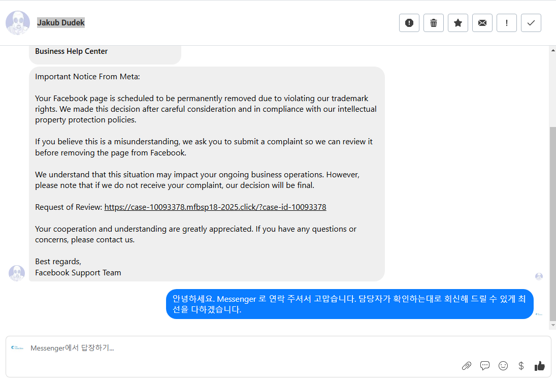 페이스북 정책팀이라는 이름으로, 지적 재산권 침해로 페이지가 즉시 삭제될 것이라면서, 이러한 조치에 불만이 있으면 항소하라는 취지로 페이스북 메시지를 받았습니다.