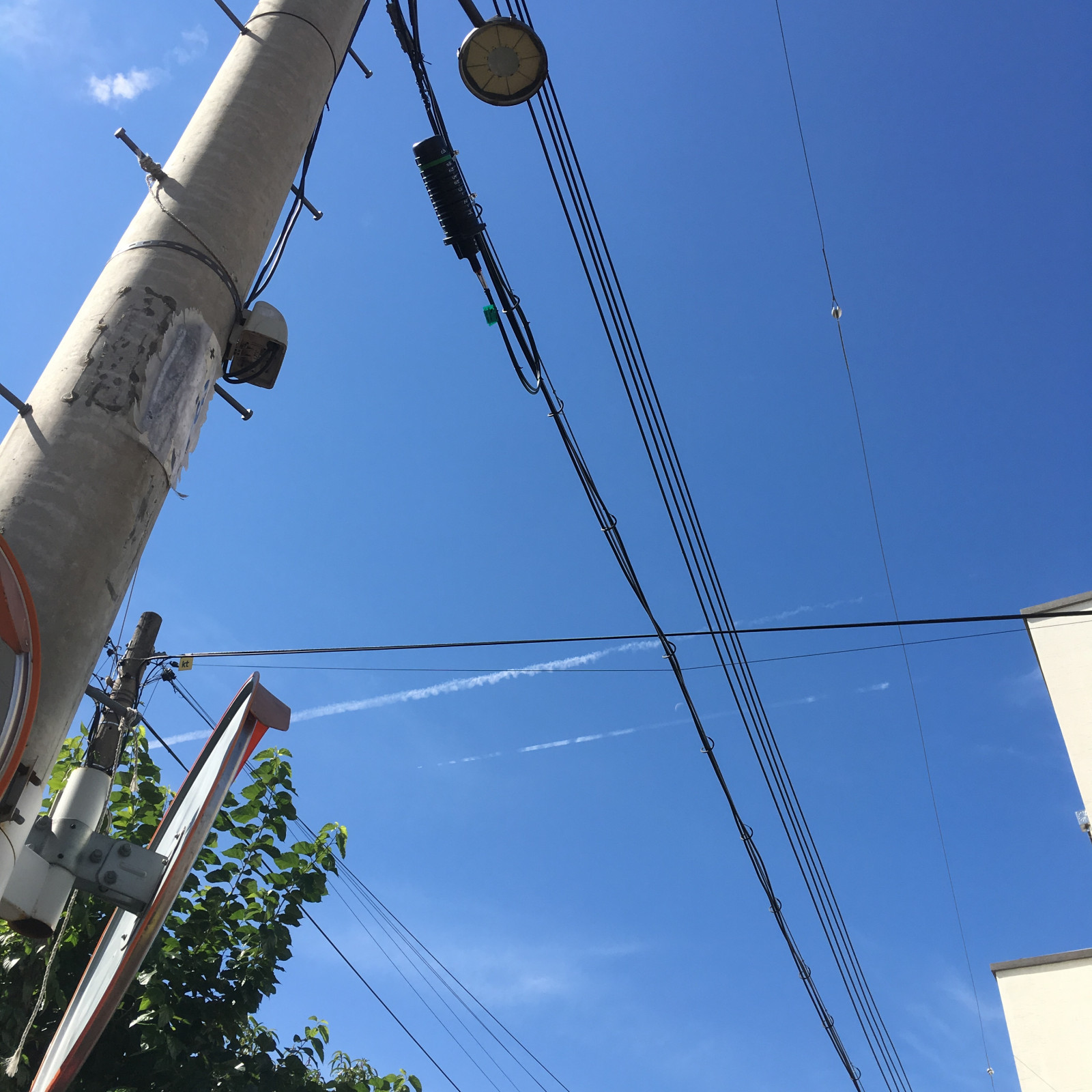 자세히 보면, 전깃줄이 교차하는 곳 아래에 그믐달이 보인다.