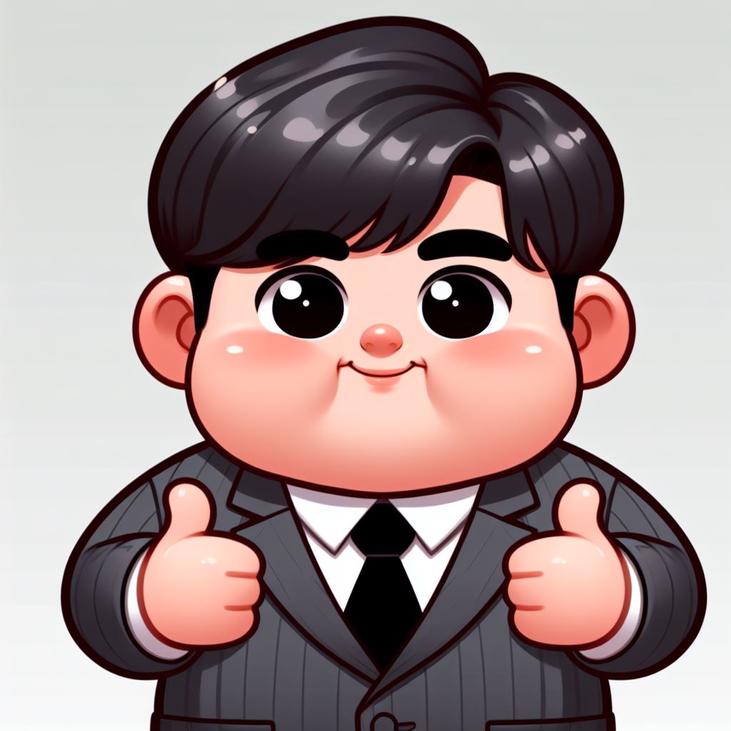 prompt : 통통하고 눈에 쌍꺼풀이 짙은 얼굴이 뽀얗고 하얀 한국인 남성, 일러스트, 애니메이션, 캐리커쳐, 엄지척, 양복