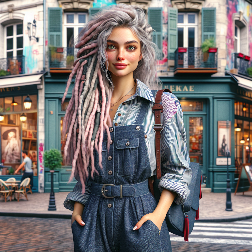 Generate a photorealistic image of a fashion influencer. She is a french young woman in her mid-20s with long, dreadlocked pink hair and green eyes. She is layered with a preppy, stylish jumpsuit paired with a denim jacket and stylish sneakers. She has a casual smile and is posing in front of a chic urban backdrop with graffiti art. She carries a laptop bag and a notebook, on her way to a business meeting. The background includes charming bookstores and cafes, with a trendy boutique with unique fashion and accessories. 2K