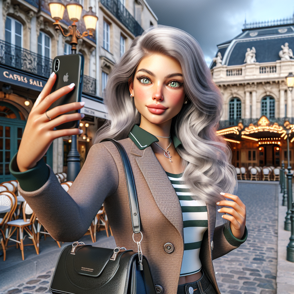 Generate a photorealistic image of a fashion influencer. She is a french young woman in her mid-20s with long, natural gray hair and emerald eyes. She is accessorized with a preppy, stylish activewear worn with a blazer and sporty trainers. She has a sophisticated expression and is posing in front of a historic theater with ornate architecture. She holds a smartphone in one hand, ready to take a selfie, and a designer handbag hangs from her shoulder. The background includes charming cafes and outdoor seating, with a cozy pub with a fireplace and cozy booths. 2K