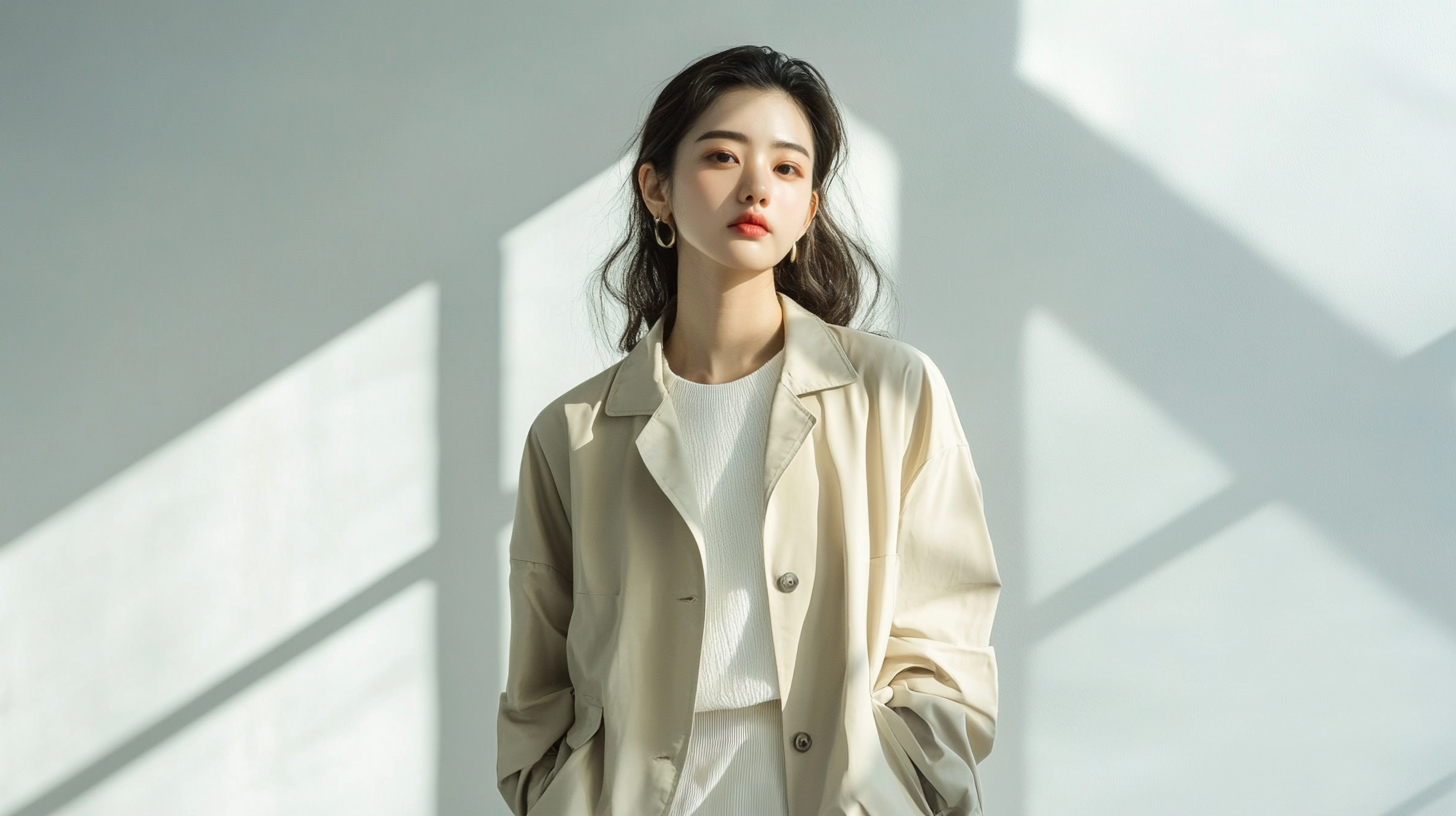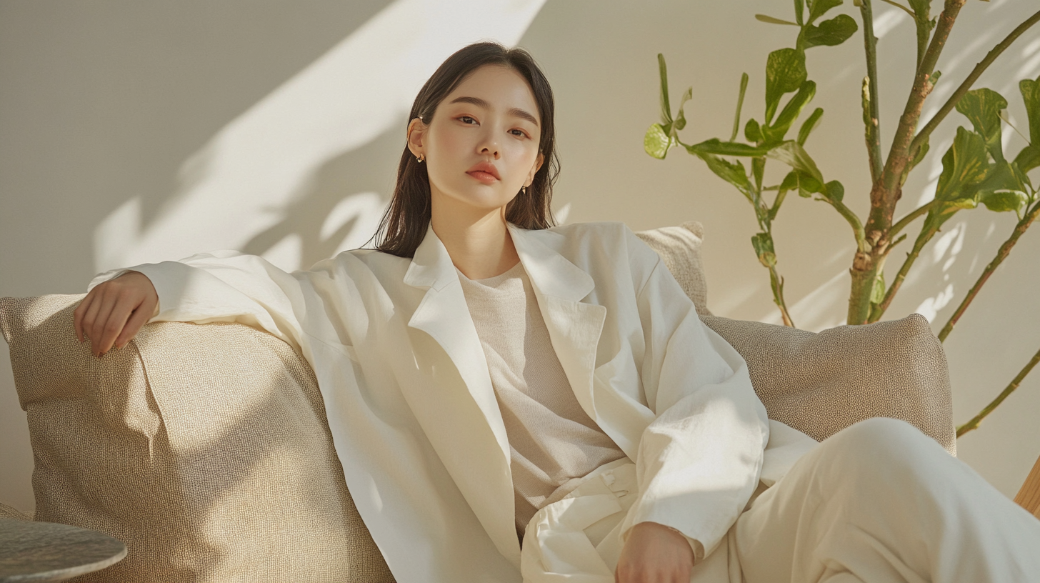 blending elements of simple with modern luxury to propose a refined yet comfortable lifestyle. model is cool korean women. The design should incorporate eco-friendly materials and minimalist aesthetics, with a focus on natural tones and textures that evoke the essence of sustainable practices like minimal. 'Designing the Future Through Innovative Reinterpretation,' and subtext highlights the brand's commitment to merging tradition and innovation, delivering unique, stylish experiences for modern consumers. Include a mix of Italian-inspired elegance with contemporary fashion and sportswear elements. The overall tone should be modern, luxurious, and environmentally conscious. --v 6.1 --ar 16:9