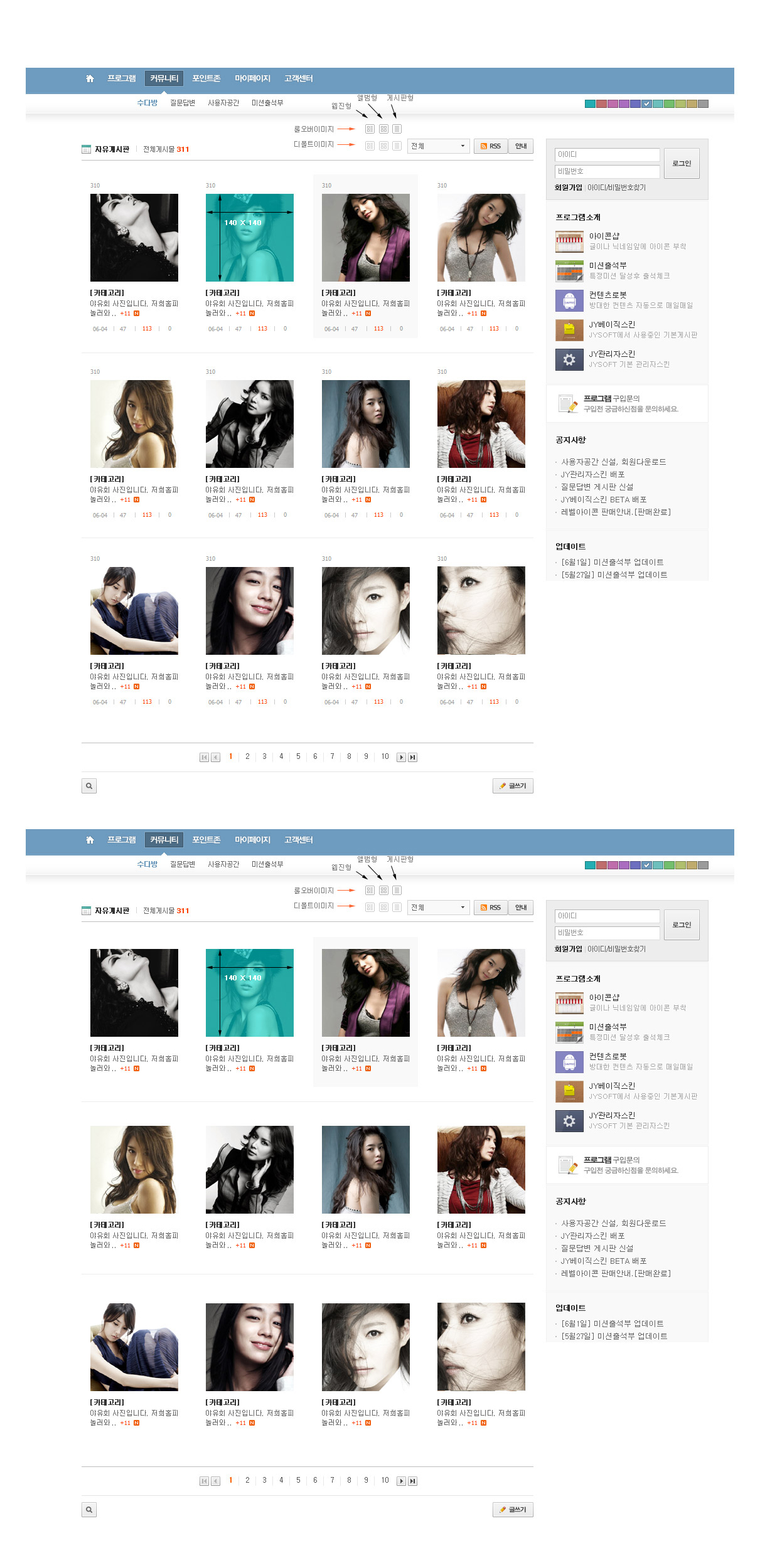 앨범형과 리스트 2타입인데, 앨범형은 날짜,조회,추천이 붙은형과 안붙은형 2가지타입니다