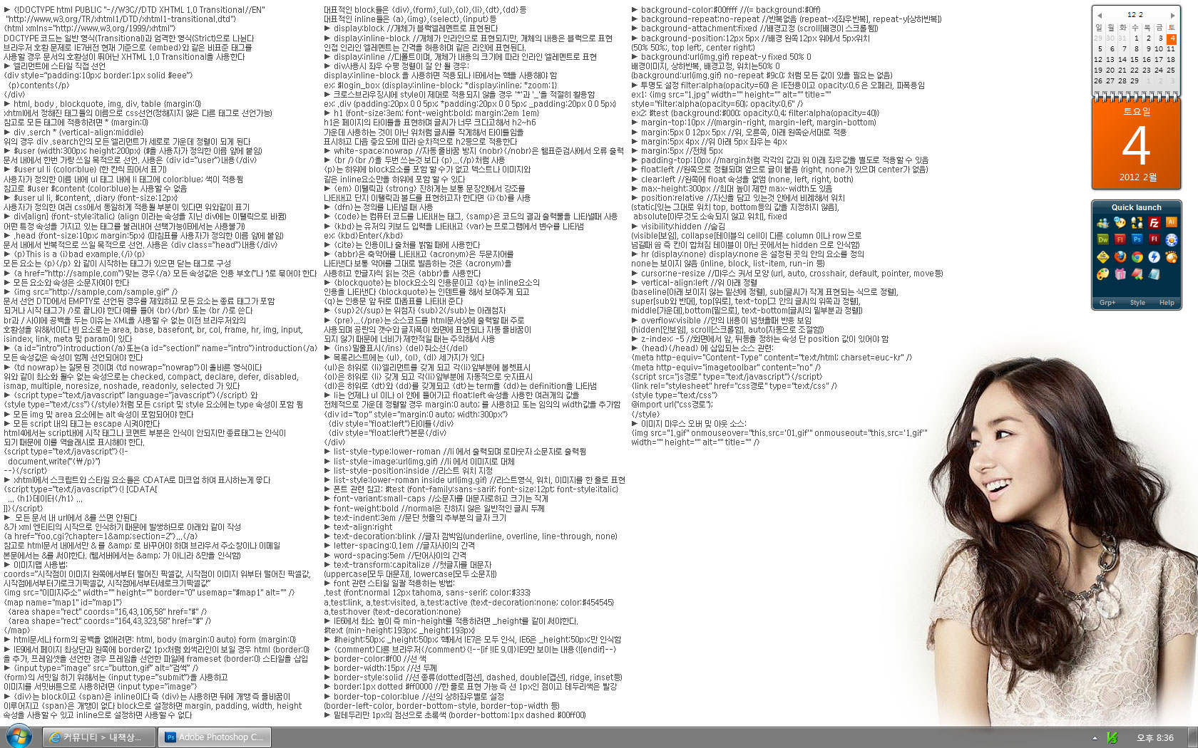 참고로 html, php, javascript, jquery등으로 바탕화면 여러개 만들어서 필요할 때 바탕화면 바꿔서 보면 소스 찾느라 낭비하는 시간을 다소 줄일 수 있습니다...ㅡ.,ㅡㅋ