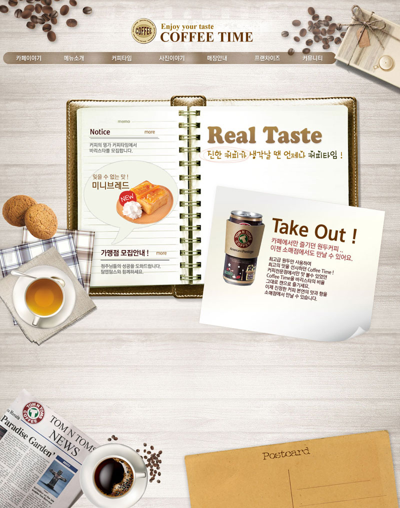 이미지가 너무 깔끔하고 이쁘게 들어갔네요~^^ 폰트 색상도 이쁘게 잘들어갔고요~^^ 왼쪽 중간부분에 찻잔이 들어갔는데 그밑에 커피잔이 또 들어가닌깐 중복느낌이 좀~ 밑에꺼는 빼는게 좋을것같아요~^^