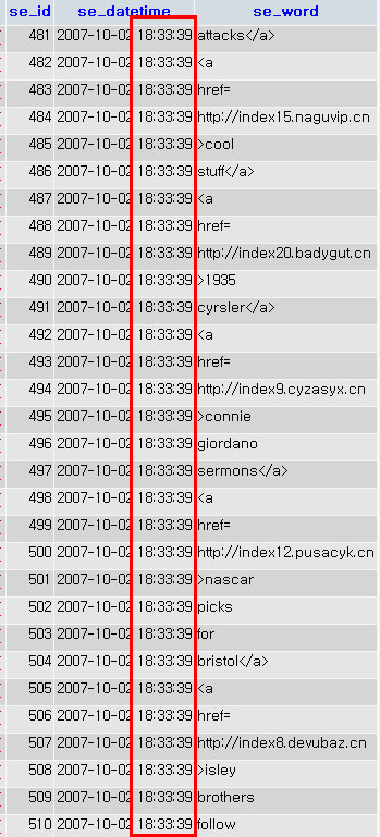 그런데, 또 갑짜기 느려지는 현상이 발생했습니다. DB를 살펴보니 검색어 로그가 엄청 쌓여 있었습니다. 그것도 같은 시간대 17-50:50 이런식으로, 동시간대에 몇백개 씩이나 스팸 검색어가 쌓여 있었습니다.