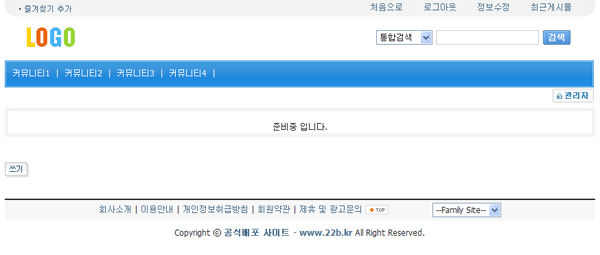 커뮤니티 그룹과 케뮤니티 게시판을 1개만 남기고 전부 삭제했더니 화면이 깨지면서 하단의 "회사소개", "이용안내" 등과 "Copylight @ ~~" 부분이 없어져 버렸네요. 커뮤니티 그룹에서 게시판 하나를 추가했더니 메뉴판의 글씨 칼라도 적용이 안되고 Index 화면은 마찬가지로 깨진 채로 있네요.