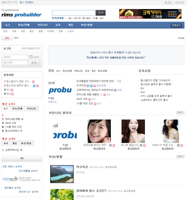 5. 빌더내 배너(림스배너,구글배너)는 샘플배너로 삭제 및 대체하시기 바랍니다. 배너는 이후 버젼에서는 포함되지 않습니다.