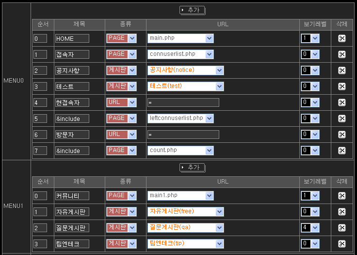 보기레벨 : 해당 메뉴를 볼수 있는 레벨을 설정해줌으로써 특정레벨 이하는 메뉴자체를 감출수가 있습니다.