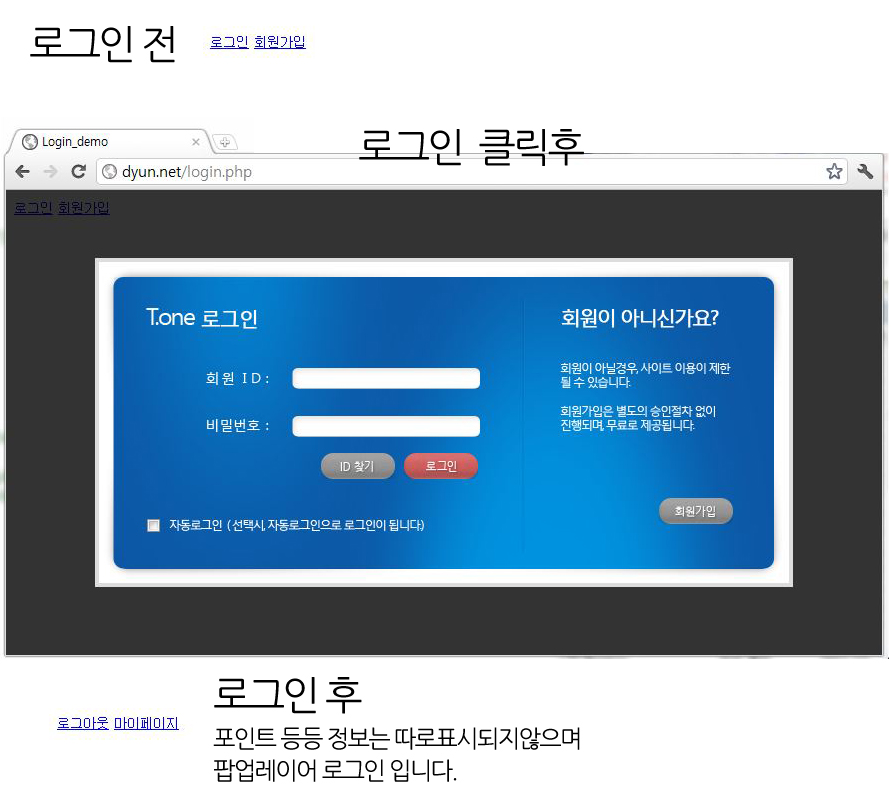 로그인버튼외에 포인트정보 쪽지 등의 정보는 표시되지 않습니다.