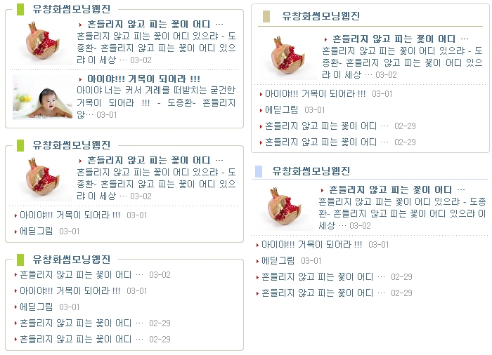 <?=latest('latest_morningWebU_GB', "게시판이름", '3', '30', "1");?>
