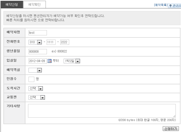 회원로그인 후 신청서 작성시 예약자 이름을 적을때 이게 회원의 이름과 예약자의 이름이 다를 수 있는데