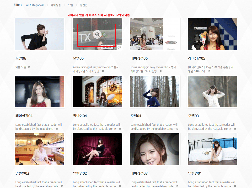 prettyPhoto와 filter를 사용한 카테고리를 지원하는 최신글갤러리을 제작하였습니다.