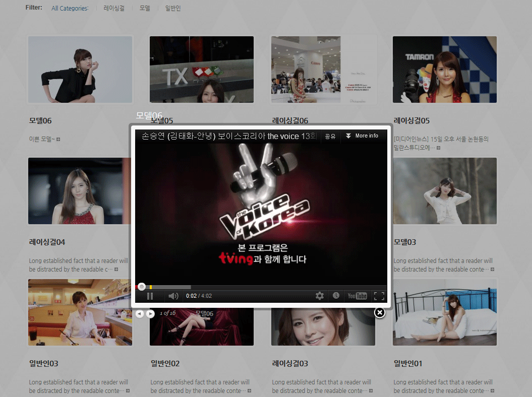 prettyPhoto와 filter를 사용한 카테고리를 지원하는 최신갤러리 (동영상도 리스트에서 시청가능)