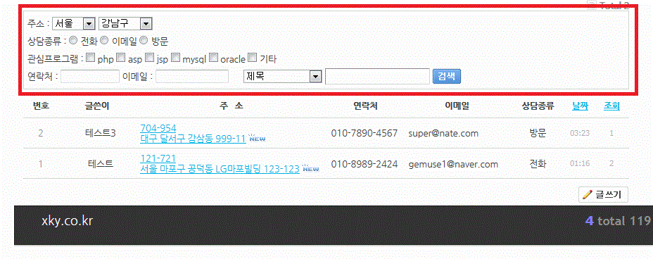 게시판 리스트에 간단히 다중검색, 멀티검색,복수검색, 여러개 검색을 로직파일 변경없이 스킨자체적으로 가능하도록 합니다.
