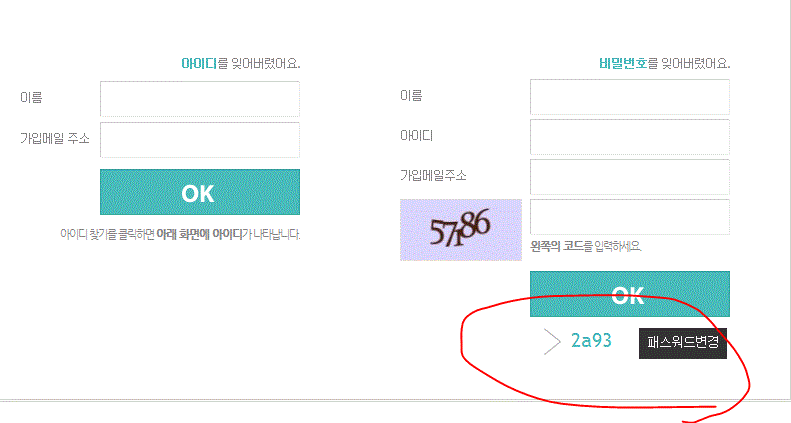 아이디찾기와 비밀번호 찾기를 햇을때 모두 ok버튼 아래쪽에 아이디와 비밀번호가 나오게 되어있으며 비밀번호는 비밀번호 변경 버튼 클릭시 변경이 됩니다.