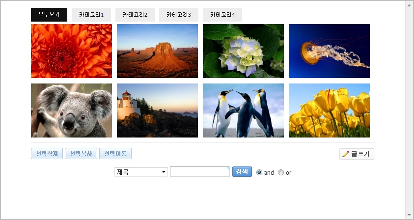 Jquery를 이용하여 카테고리별로 정렬해주는 갤러리 게시판입니다.