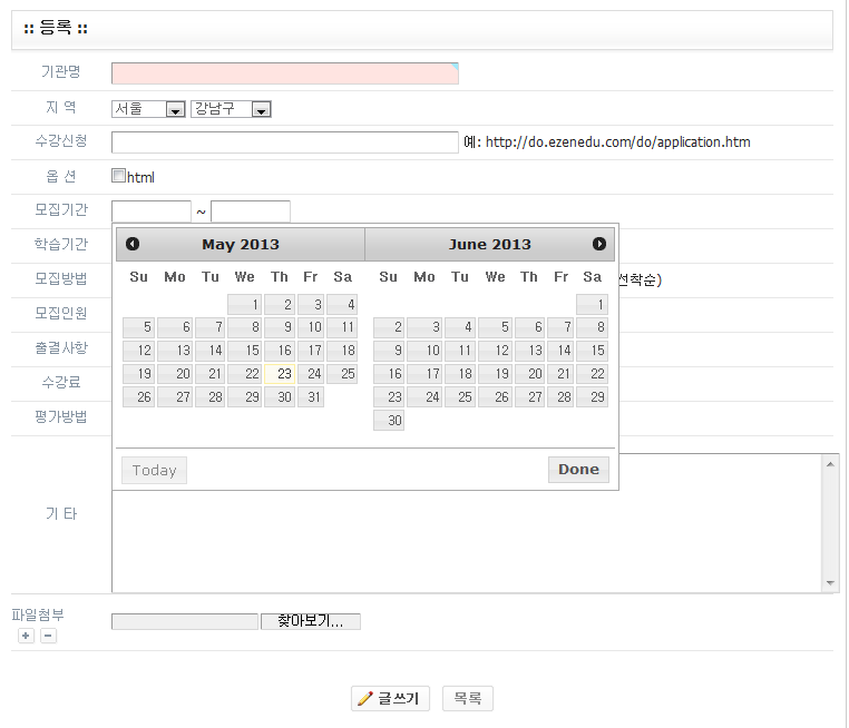 주소와 날짜 등록 부분을 jQuery를 사용해서 모두 개선했습니다.