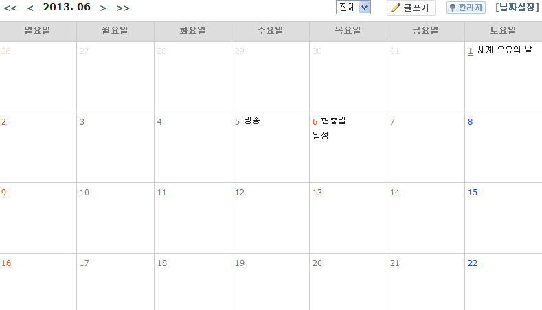 달력 게시판에서 일정 및 휴일 설정을 할수 있습니다.