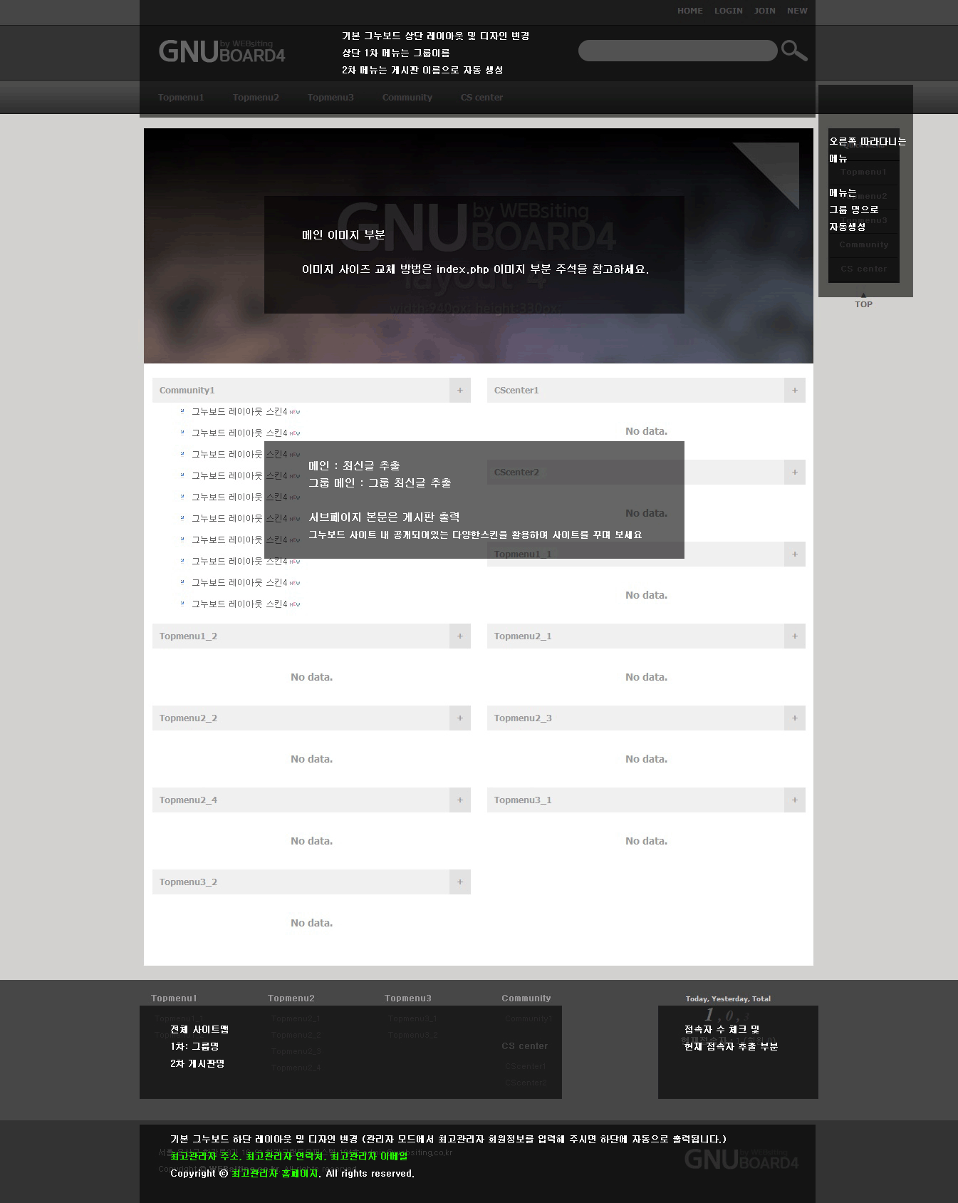 - 전체적인 레이아웃 및 상단, 하단, 최신글스킨, 현재접속자스킨, 방문자스킨이 적용되었습니다.