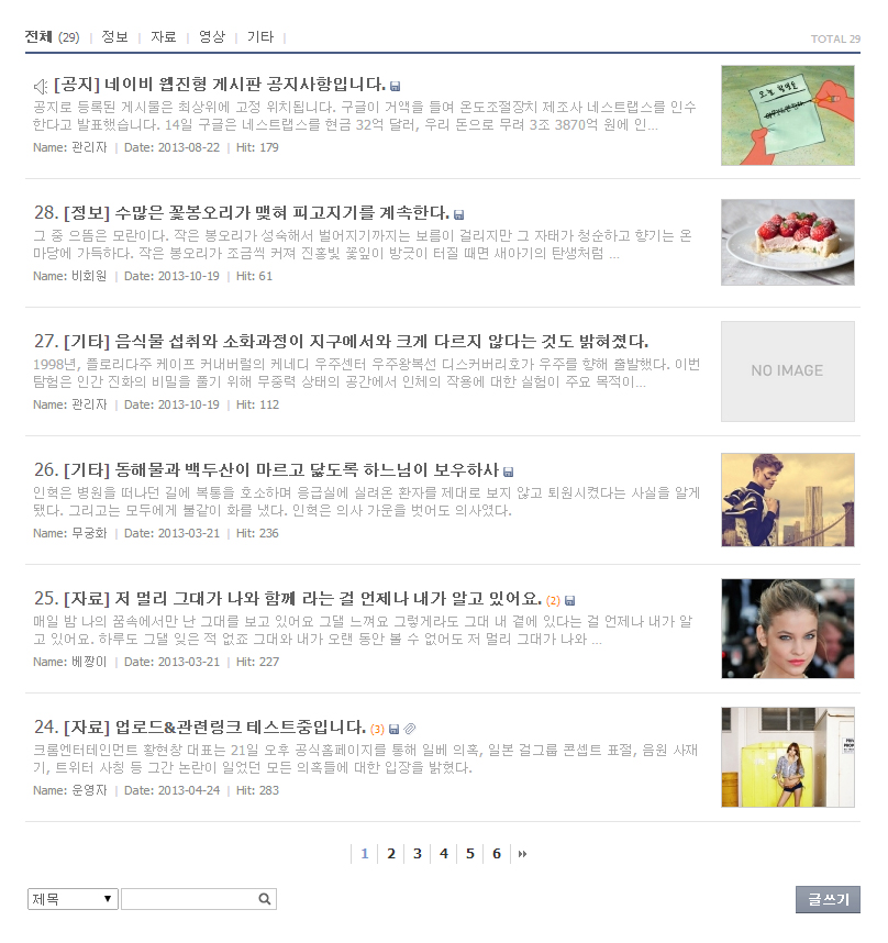 리스트에서 게시물 번호출력 및 글자 크기 강조, 섬네일 위치만 변경되었습니다.