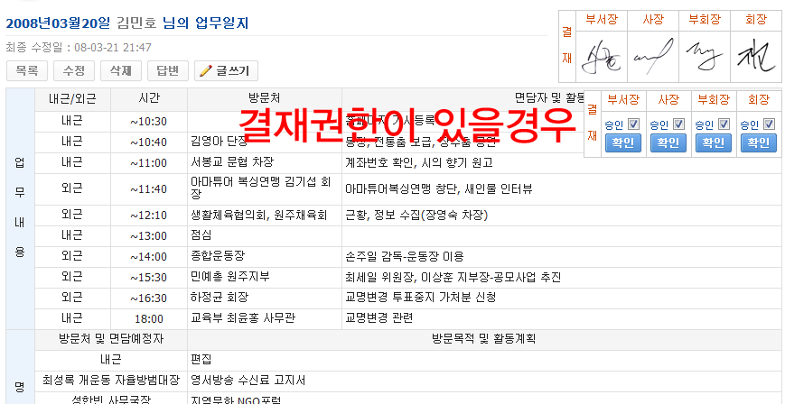 예를 들어 업무일지 결재를 이사 가 하고, 다음 전무가 결재하면 전에 결재한 이사의 결재 싸인이 사라져 버립니다. 어디가 잘못인지 저는 아무리 보아도 모르겠네요.