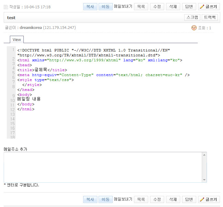 아래 이미지 메일링 보기 화면이면 아래에 보내는 사람 이메일을 등록하여 메일링을 전송하는 폼입니다.