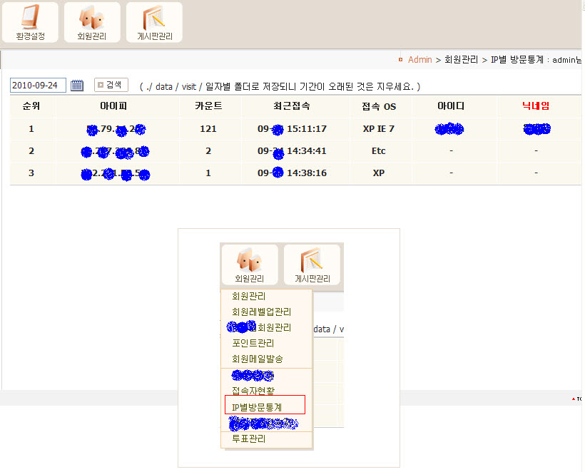 그리고 기존의 visit_ip.php 파일을 사용하도록 하고 이 파일은 visit_ip2.php 로 되어 있어서 매뉴에서 별도로 불러오도록 하였습니다. 만약 덮어쓰시려면 파일명을 변경하셔서 하시면 됩니다.