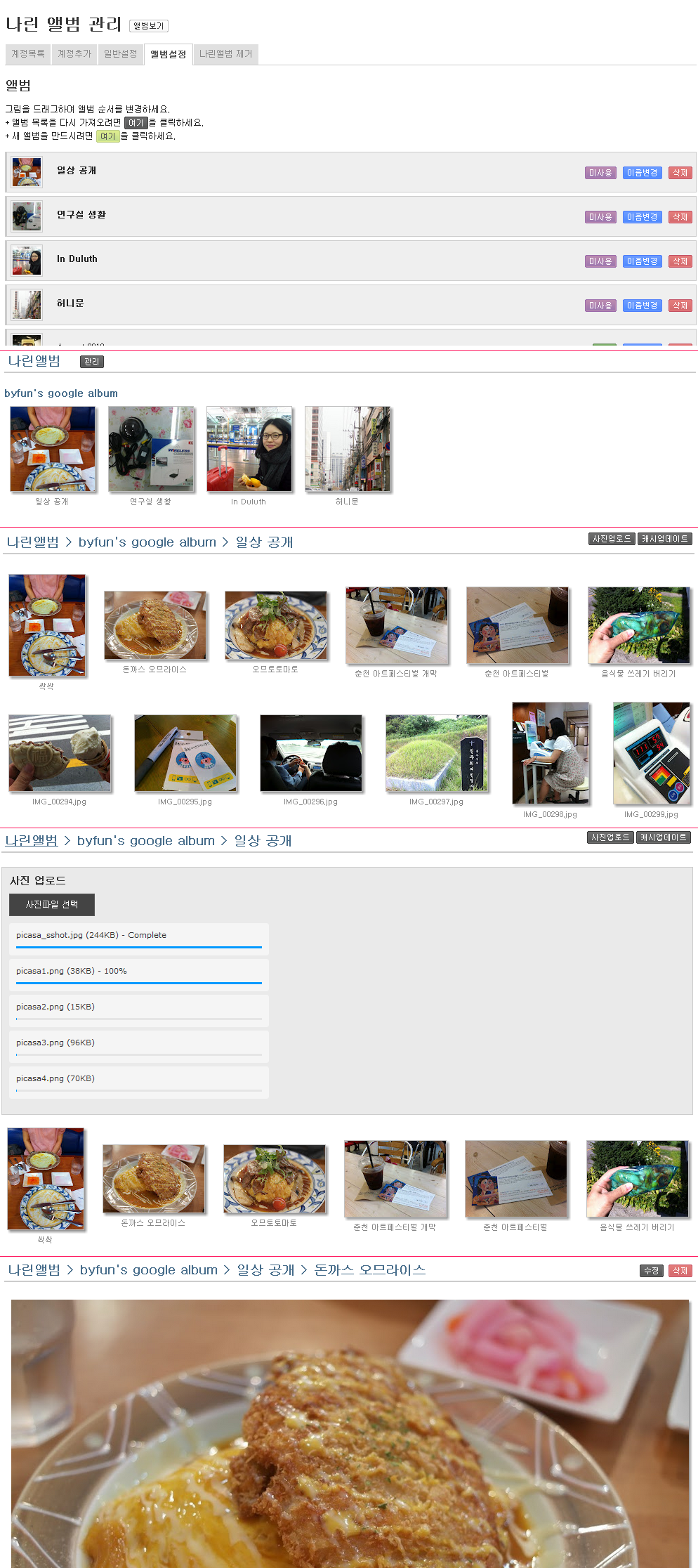 구글 계정 하나당 기본적으로 1G 니까..(구글+ 사용시 무제한) 계정 몇개 만들어서 연결해 놓으면... 몇기가짜리 앨범 생긴다고 생각하시면 될것 같습니다. 그런 컨셉으로 만들었습니다. 그리고 저 같은 경우는 피카사웹 연동 앱을 스마트폰에 깔아서 핸펀으로 찍어서 피카사웹에 연동시킵니다. 그러면 나린앨범에도 나타나게 됩니다. ^^