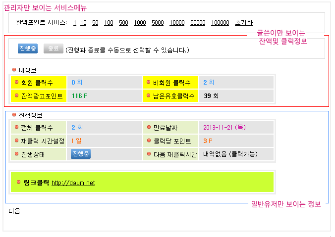 충전된 광고포인트가 자동 차감되며, 링크를 클릭한 회원은 포인트를 획득 할 수 있습니다.