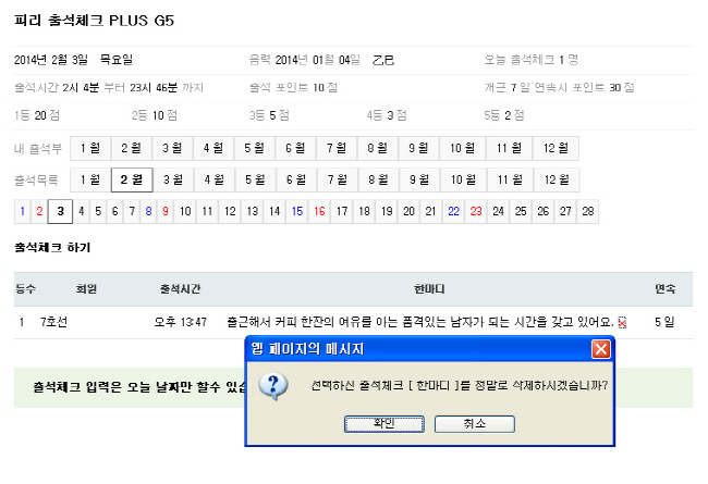 - 관리자가 광고, 욕설, 비방등 출석체크 한마디 삭제 지원