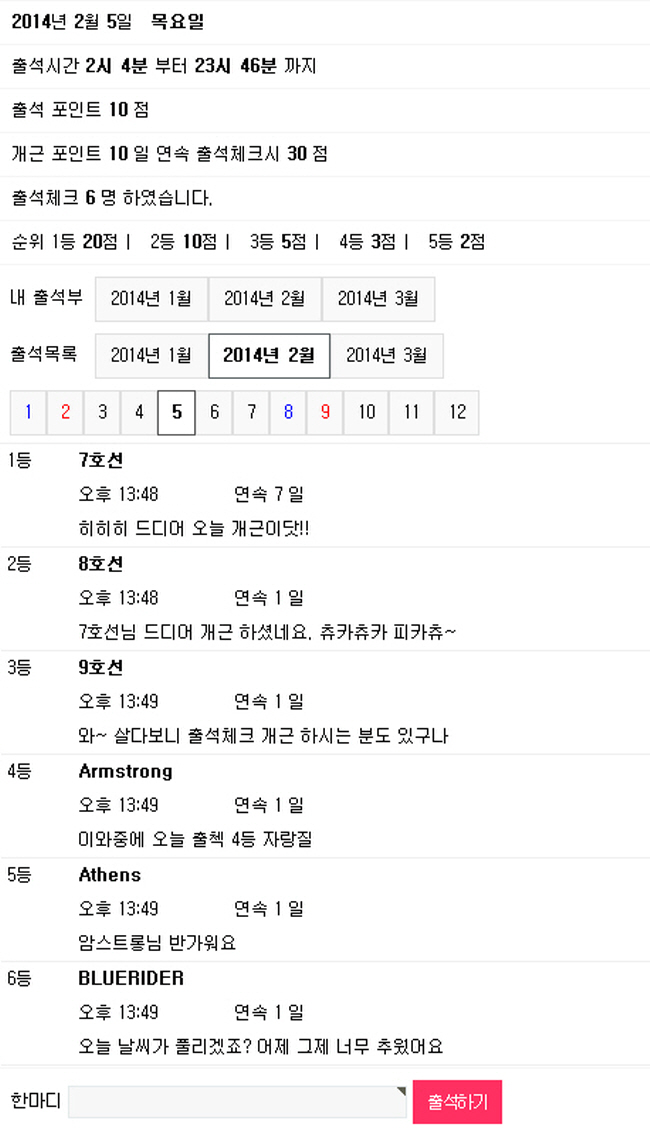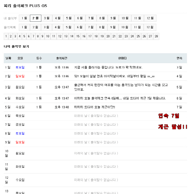 - 출석체크 월별 나의 출석부 보기 (날짜, 요일, 등수, 출석시간, 한마디, 연속일수 목록보기)