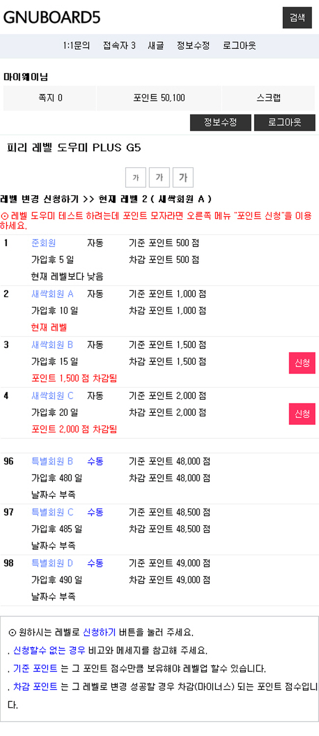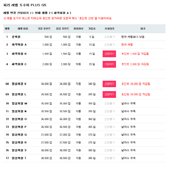 - 포인트와 가입후 경과일에 맞게 레벨 업 신청