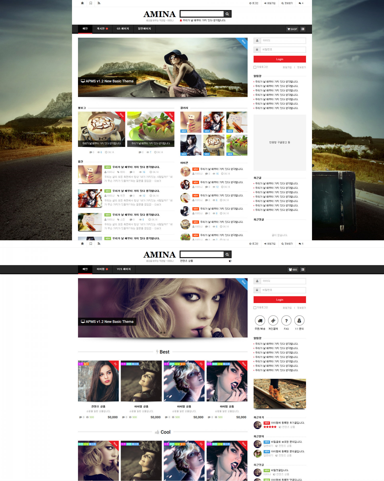 ※ 부트스트랩3 기반에 반응형/비반응형 통합 레이아웃으로 데모사이트( http://amina.co.kr/demo/?pv=Basic )의 좌측에 있는 Switcher에서 반응형/비반응형에 따른 레이아웃 설정 및 위젯설정 등을 미리보기하실 수 있습니다.