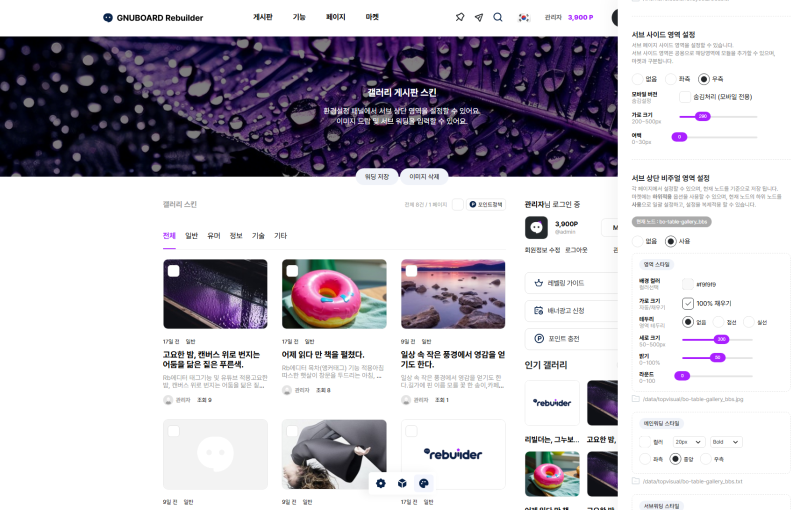 6. 환경설정 > 테마설정 에서 GNUBOARD Rebuilder Basic 테마를 적용 합니다.