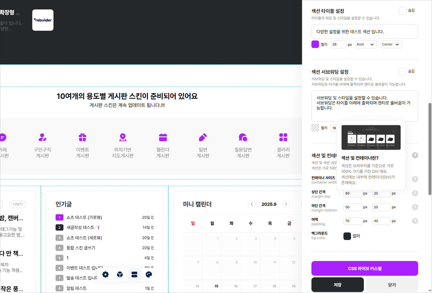 모듈설정 및 섹션설정 패널에서 CSS를 즉시 수정(오버라이드) 할 수 있습니다.