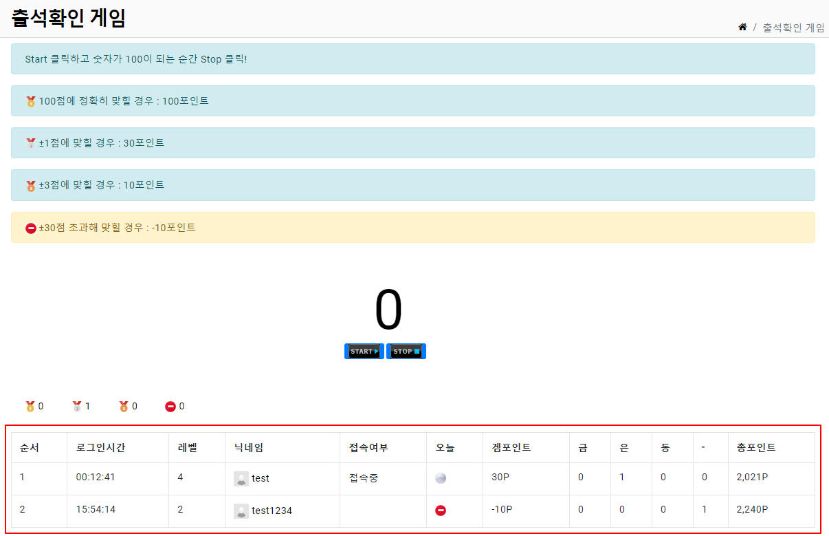 웹학교에 올려 테스트했습니다. (/game/attendance)